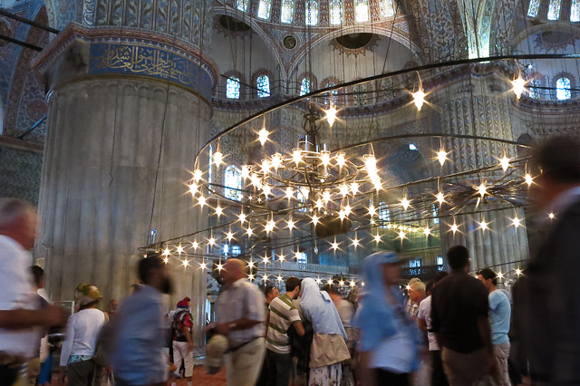 Ils arrivent par dizaines, leurs chaussures pendant dans un sac de plastique au bout des doigts. Ils enjambent en habitués la clôture posée là pour retenir les touristes curieux. Ils font acte de foi chacun à leur façon, certains agenouillés, d’autres debout. Ils opèrent en silence et je n’entends que le murmure de leurs prières au loin. Les lustres blanchâtres éclairent leurs silhouettes qui se reflètent sur le tapis rouge.